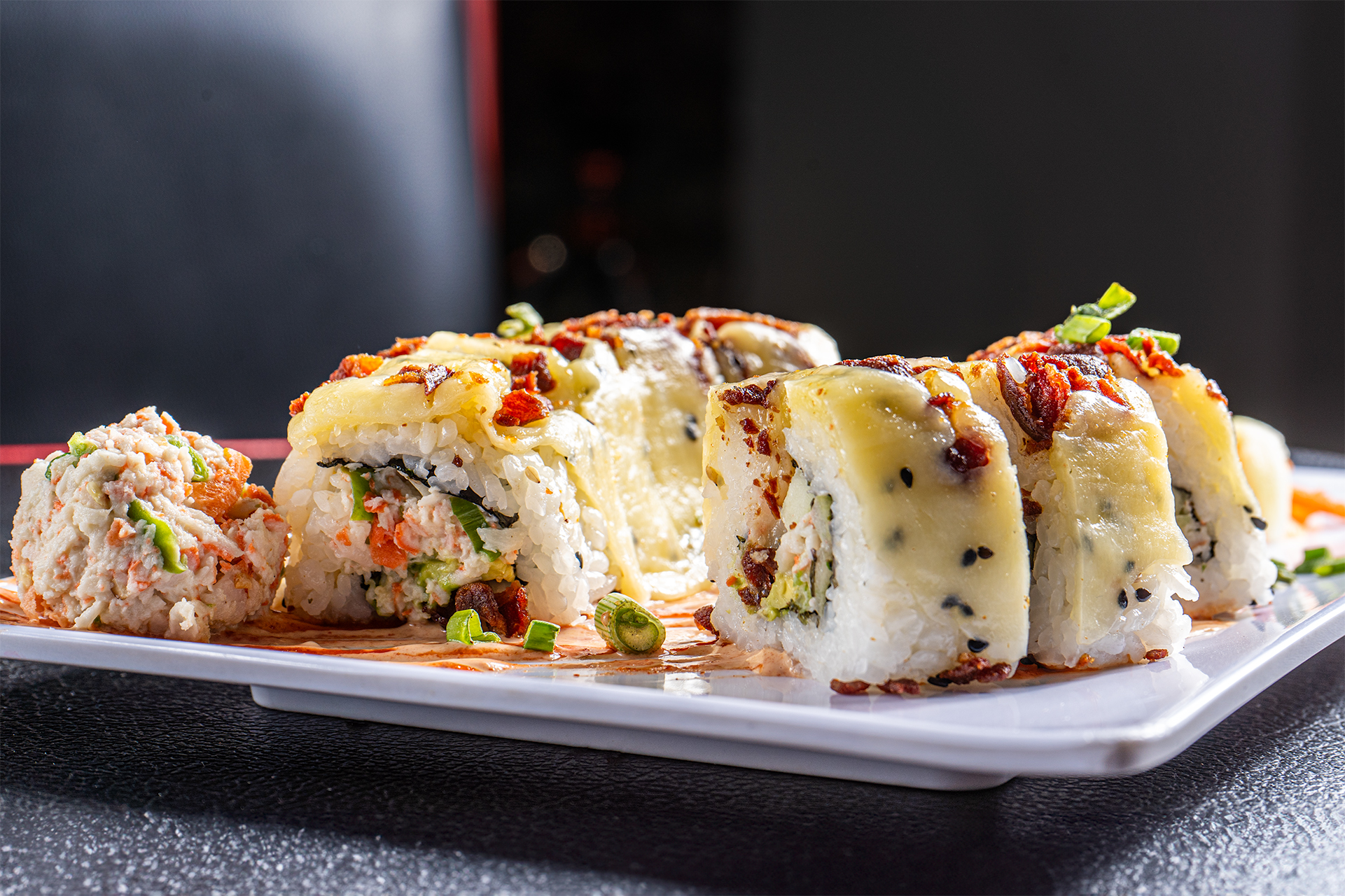 Aguacate, philadelphia, pepino camaron, chile caribe surimi capeado, por fuera queso gratinado y delicioso tocino. (10 pz)
