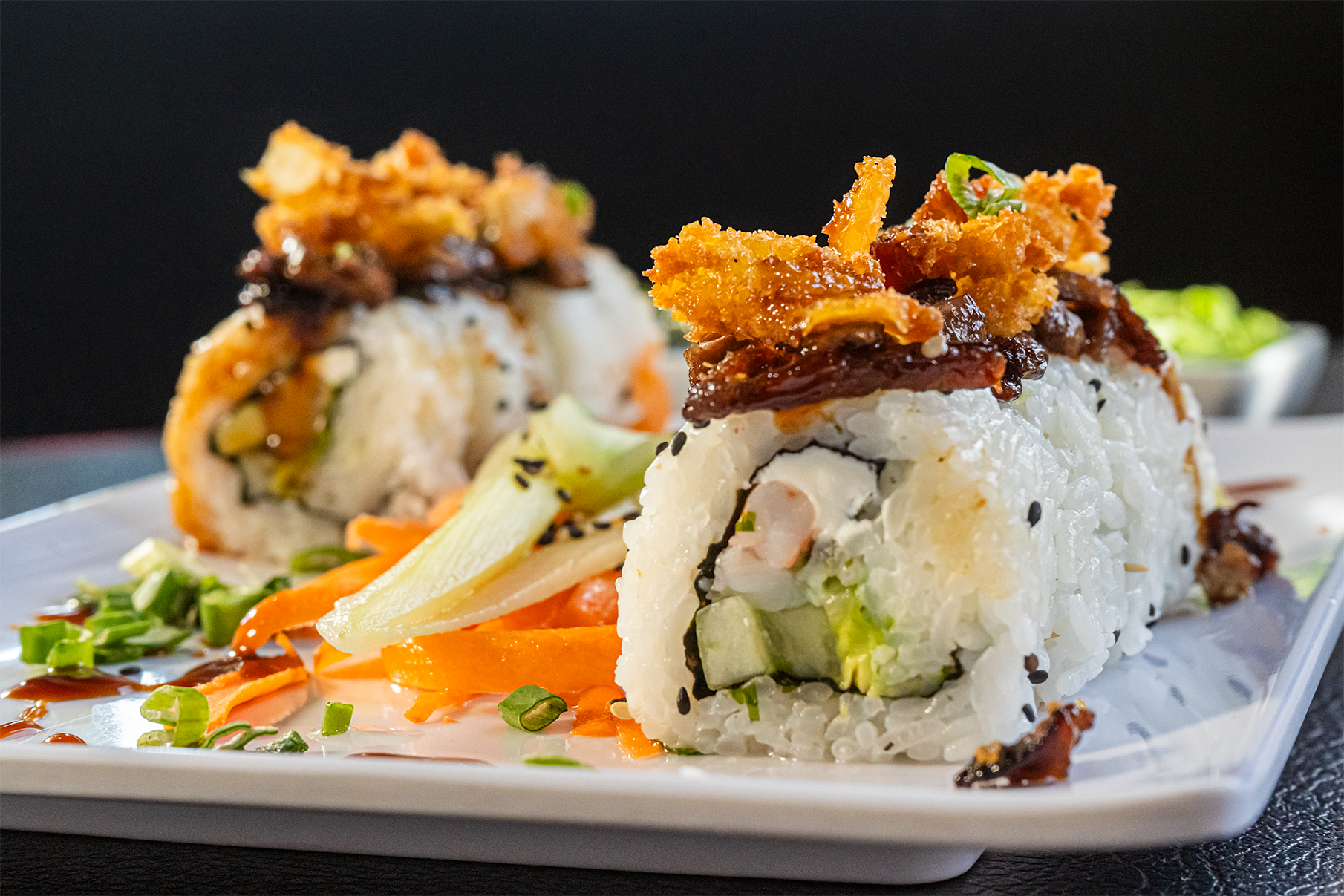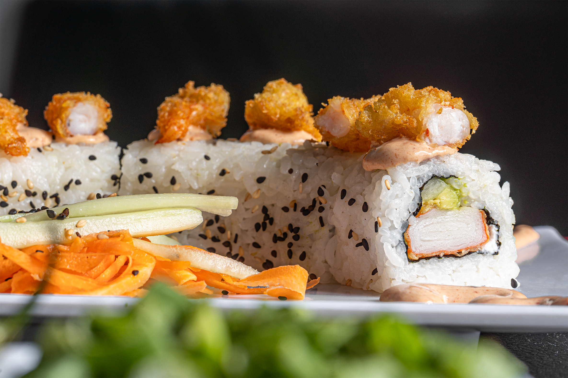 Aguacate, philadelphia, pepino y camaron, Bañado en una lluvia de zanahoria capeada y aderezo de serrano. (10 pz)