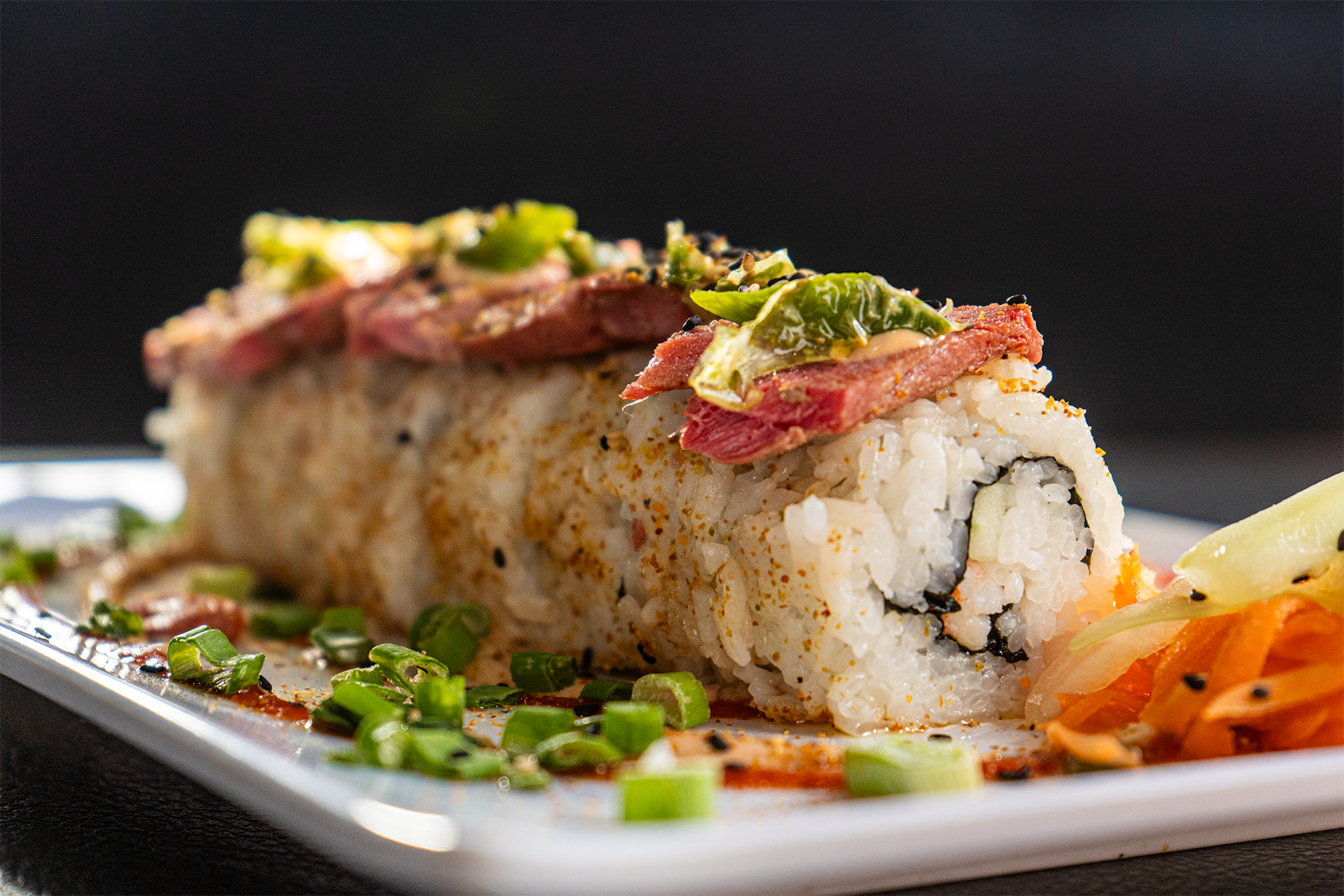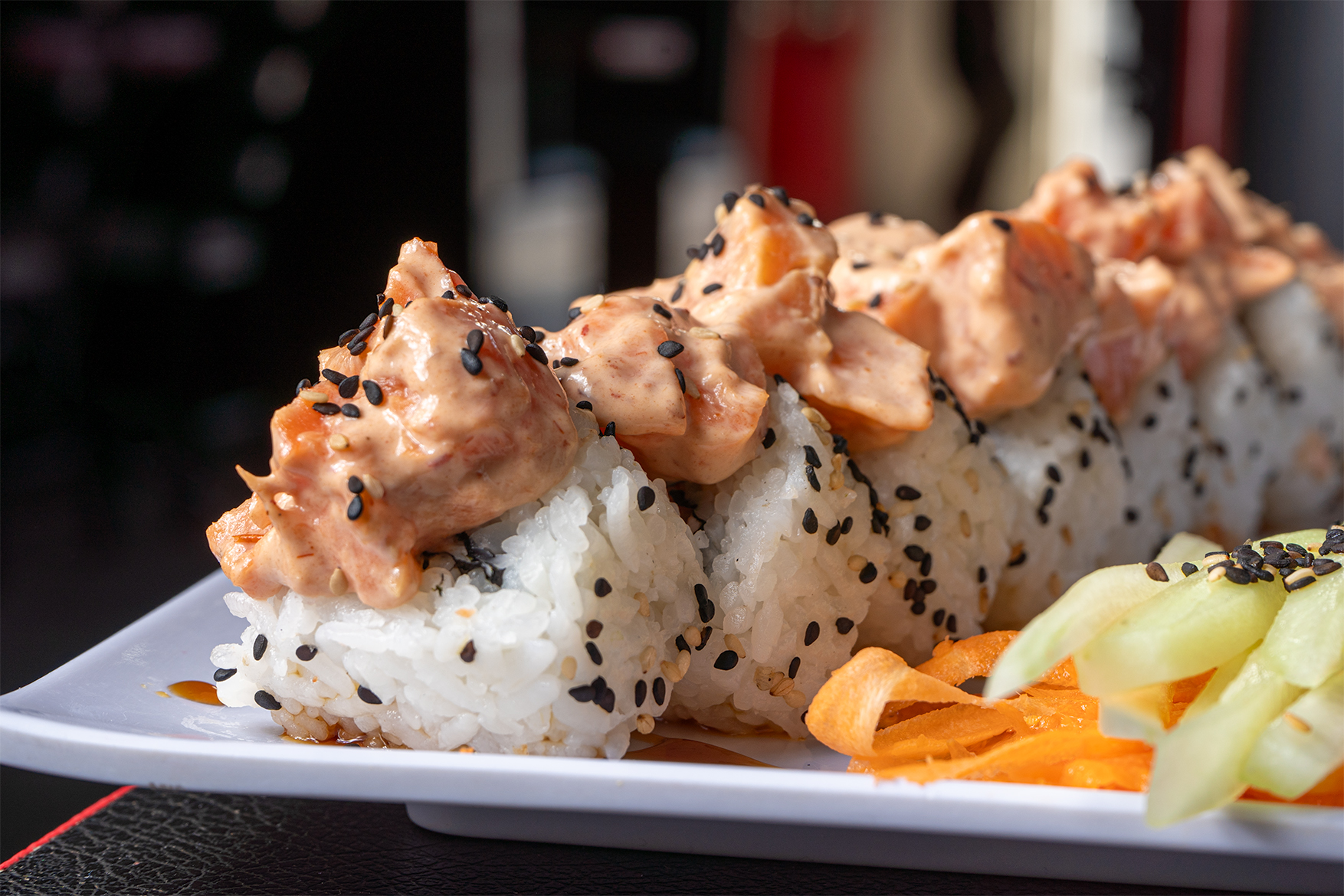 por dentro camaron, aguacate, pepino y queso crema, por fuera atun spicy decorado con ajonjoli negro